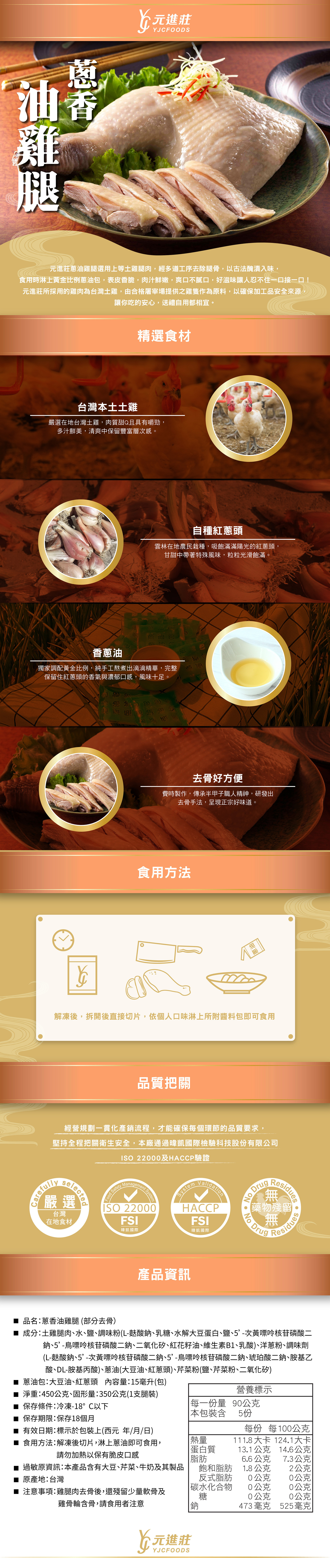 榮獲比利時iTi、清真、銀髮友善等認證 多道工序除腿骨 使用雲林在地紅蔥頭煉製蔥油,皮脆肉Q 清爽不油膩,香氣誘人。