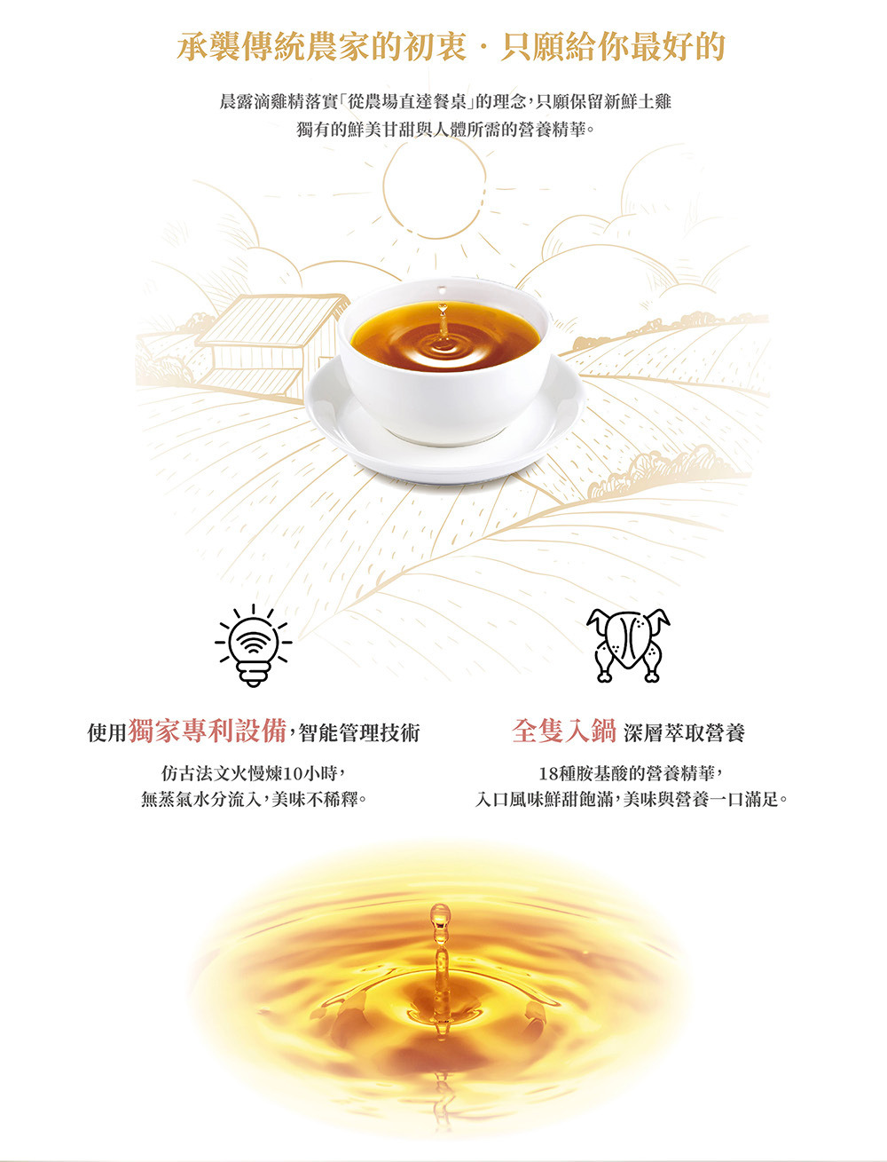 ◆專利設備古法慢火蒸煮10小時,一隻土雞只能滴出2.3包滴雞精,一包就能喝到半隻雞營養
