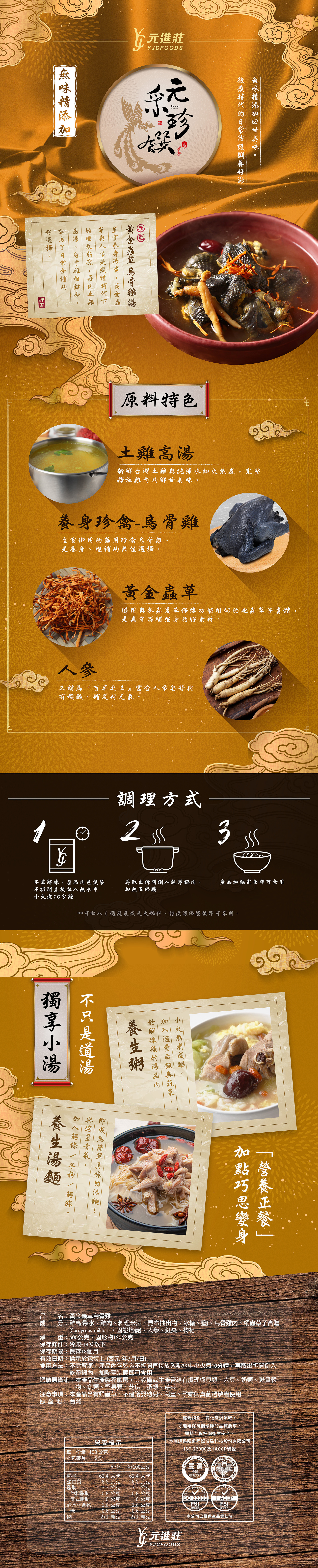 選用台灣本土烏骨雞,搭配黃金蟲草、枸杞、紅棗和人參 細火慢燉,香醇好滋味。