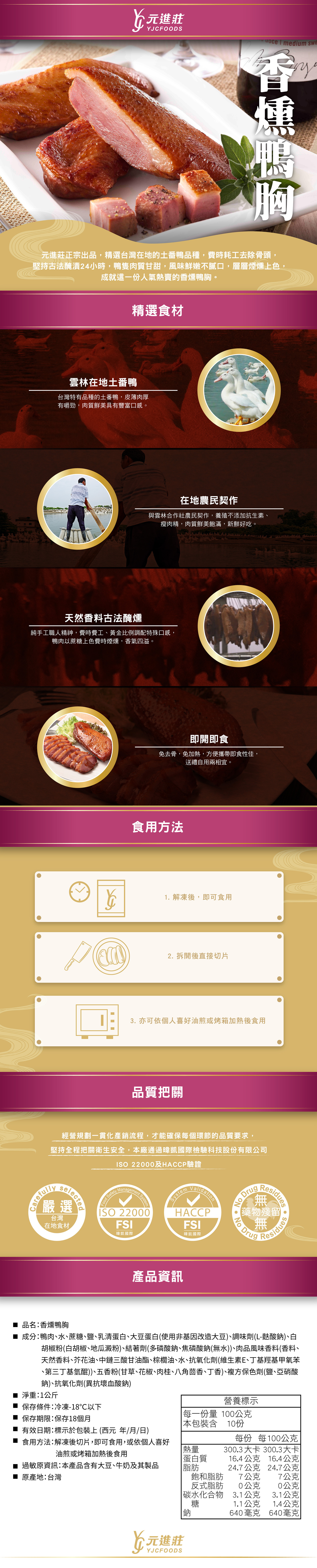 嚴選台灣在地養殖土番鴨,精心熏制,肉類鮮甜細嫩 口感清爽不油膩,去骨胸專業真空按摩 解凍切片即食,烤箱油煎香氣倍增